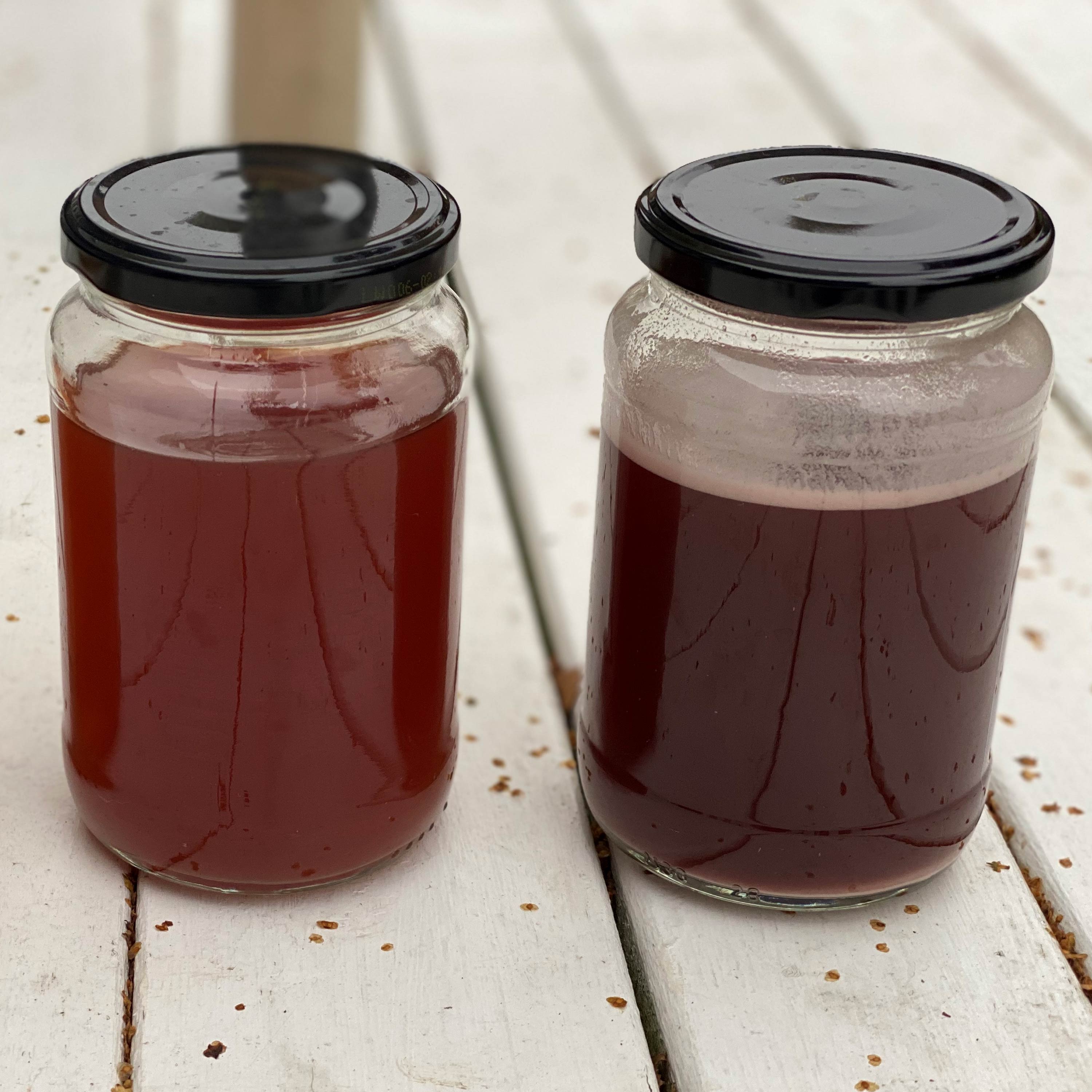Man kan tilsætte lidt bagepulver til farvebadet, som så bliver mere basisk og mere pink. Det har jeg derfor prøvet på resterne af farvebadet lavet på stenene. Her kan de to farvebade ses og det ser ud som om farvebadet med bagepulver er blevet mere rødt og i hvert fald mørkere.