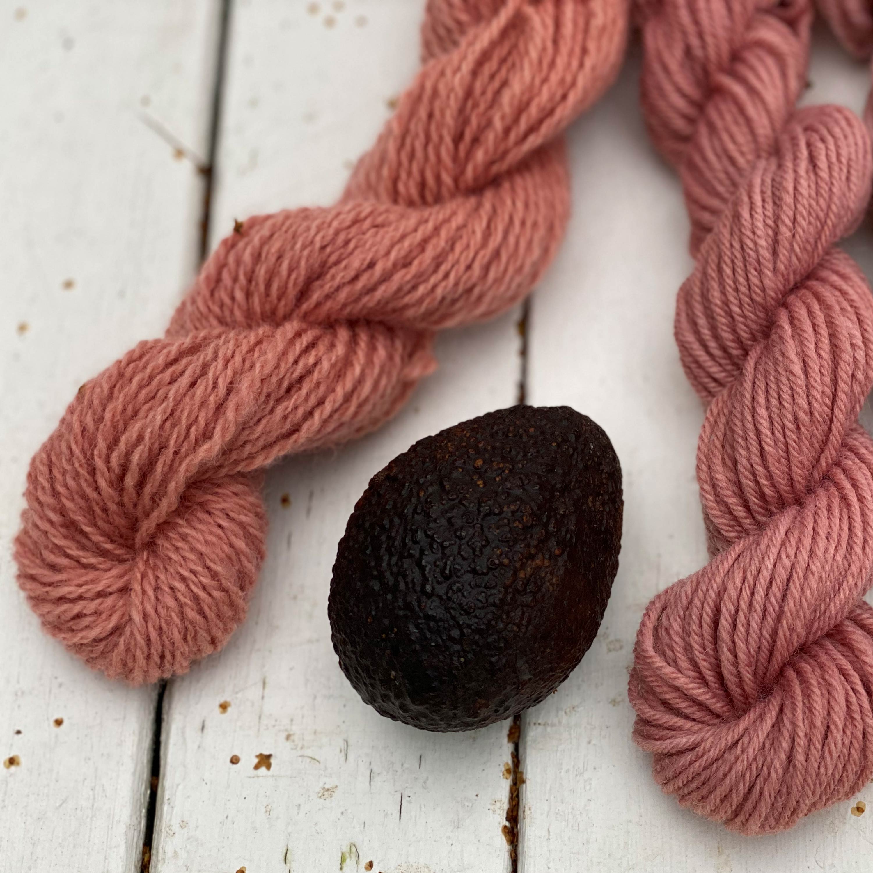 Garnet fra farvebadet lavet på avokado stenene er blevet nogle rigtig fine lyserøde toner, mens garnet fra farvebadet lavet på skallerne er blevet mere gulligt og ikke specielt spændende. Men det er rigtig sjovt at se, at der er den store forskel i tonen alt efter om farvebadet laves på sten eller skaller. I fremtiden tror jeg kun jeg vil samle sten til farvning. De fylder også mindre i fryseren.