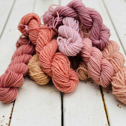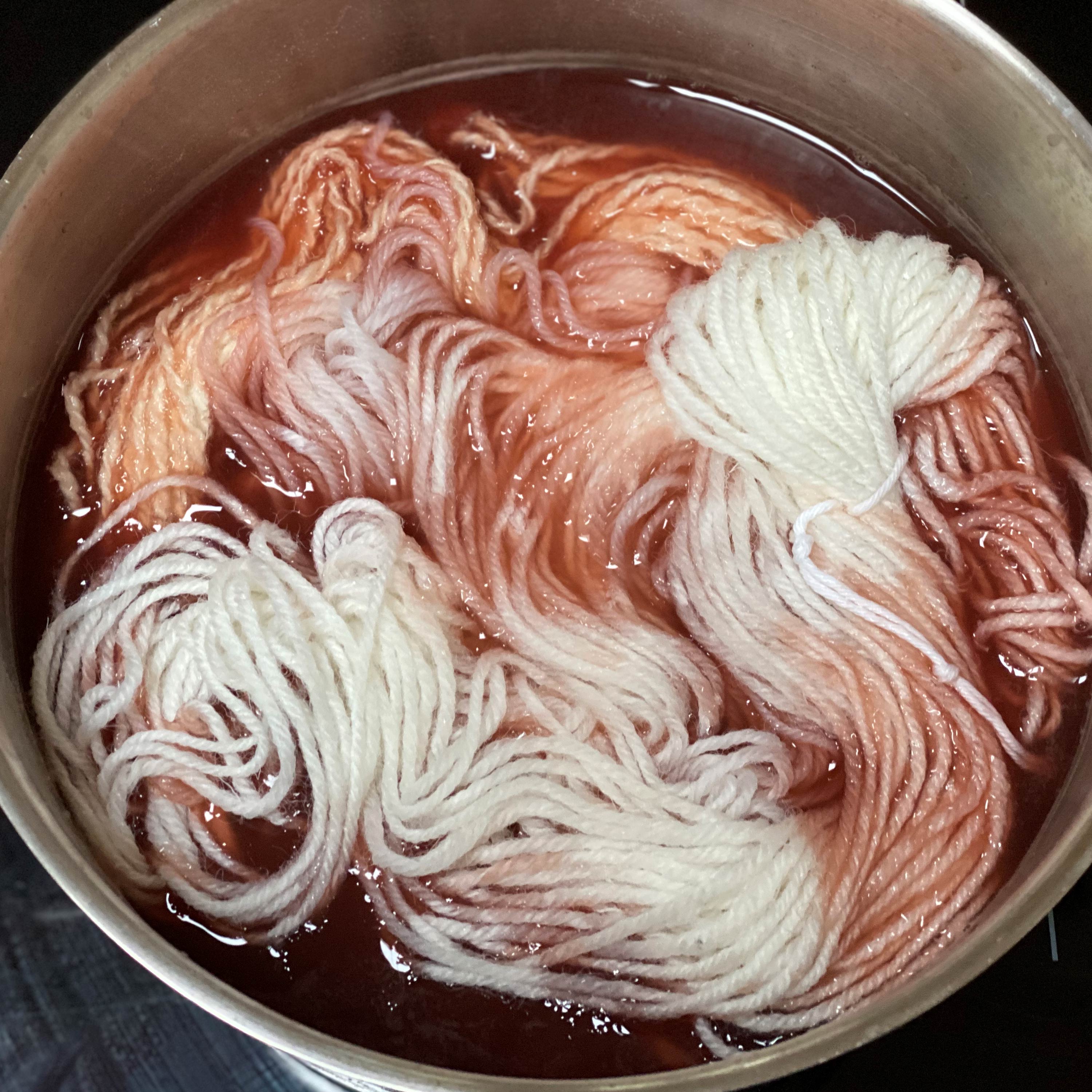 Når garnet er helt tørt kan man farve det igen, og farven bliver mere mættet men beholder den smukke lyserøde tone.